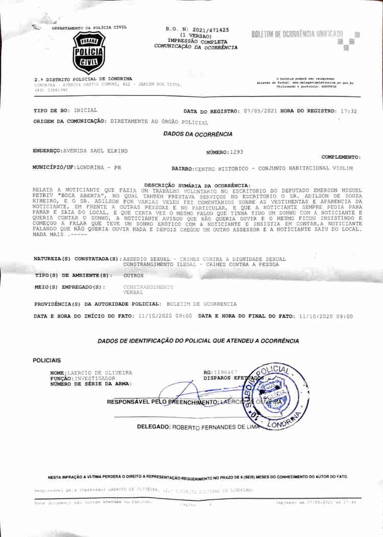 A vereadora Mara boca Aberta, esteve na delegacia de Policia de Londrina, onde oficializou uma queixa contra um assédio sexual que ela sofreu do guarda municipal e assessor do vereador Deivid Wisley, Adilson Ribeiro. A Vereadora afirma que foi importunada sexualmente diversas vezes através de comentários. Em uma de suas investidas ,Adilson teria relatado um sonho erótico com a Vereadora. Adilson disse que "revelaria detalhes dos sonhos pessoalmente e sussurrando em seu ouvido", o que foi repelido pela vereadora. O fato inclusive teve testemunha ocular que afirma a ocorrência, e esta a disposição da justiça. Mara Boca Aberta, agora presidente da comissão da Mulher na Câmara de Vereadores, teve acesso as informações de abusos anteriores praticados pelo Guarda Municipal, o que a fez procurar a policia, para prevenir que outras mulheres fossem vitimadas com este abuso. A vereadora diz que vai tomar outras medidas contra o Assessor, inclusive como pedido na justiça de medida protetiva que vise o distanciamento do abusador. O mesmo Guarda foi denunciado pela mesma pratica em 2013 por três mulheres , duas enfermeira e uma médica.